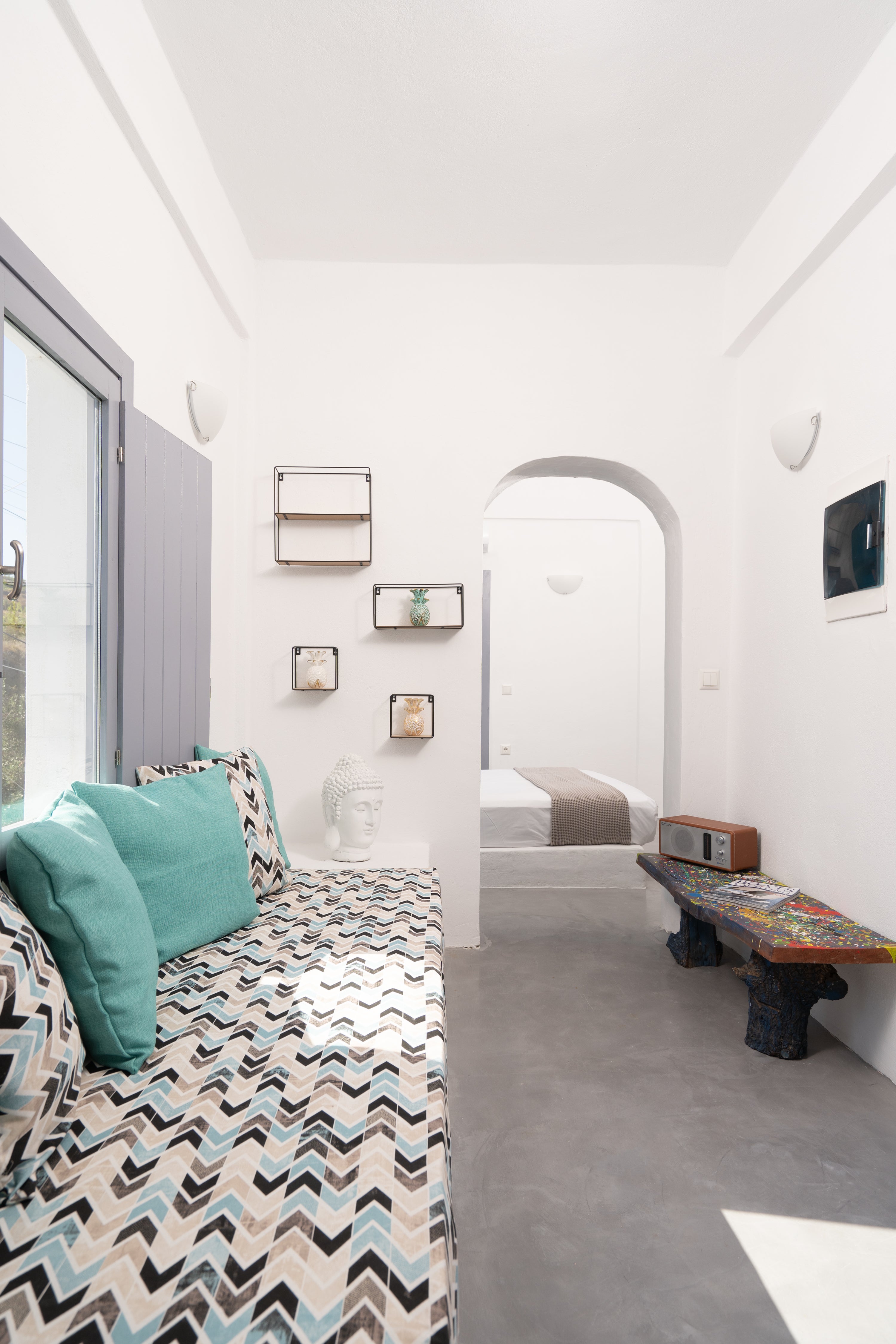 A cozy and functional room with the traditional Santorini vibe.This modern room offers a lounge area with a sofa,a modern kitchen with all appliances ,a spacious double bedroom and a bathroom. You will love the amazing views to the east and the sunrise. There is also a spacious pool area with sunbeds that is shared with the other guests of the complex.