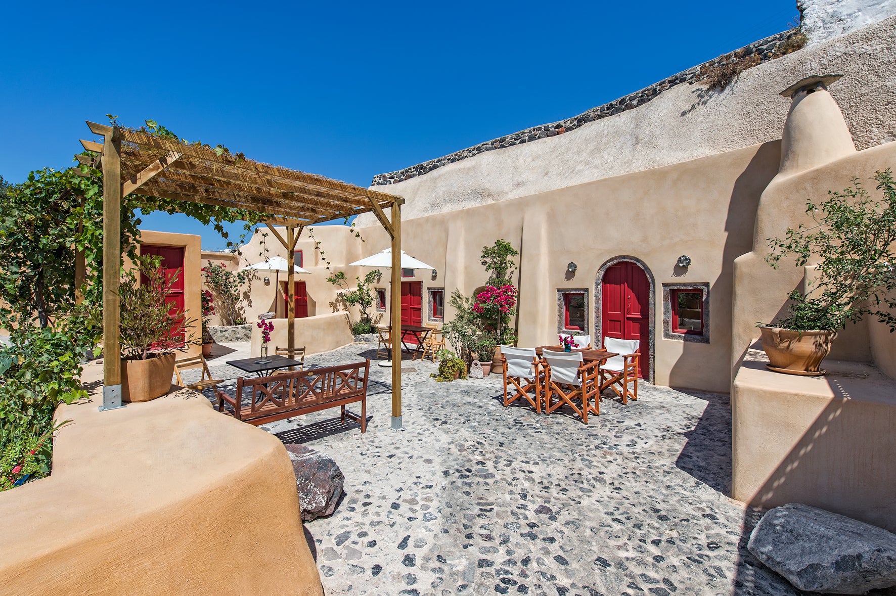 A little wooden gate opens from the footpath into the private enclosed courtyard, surrounded by plaster walls of soothing earth tones with original volcanic stone arches. There are several outdoor areas to enjoy here, surrounded by views of the surrounding village or the distant sea. An arbor with lush climbing vines heavy with fresh grapes provides shade from the bright sunlight. The dini Greece Amelie Canaves Giasemi-by Thireon Cave vacation rental best price 9900832