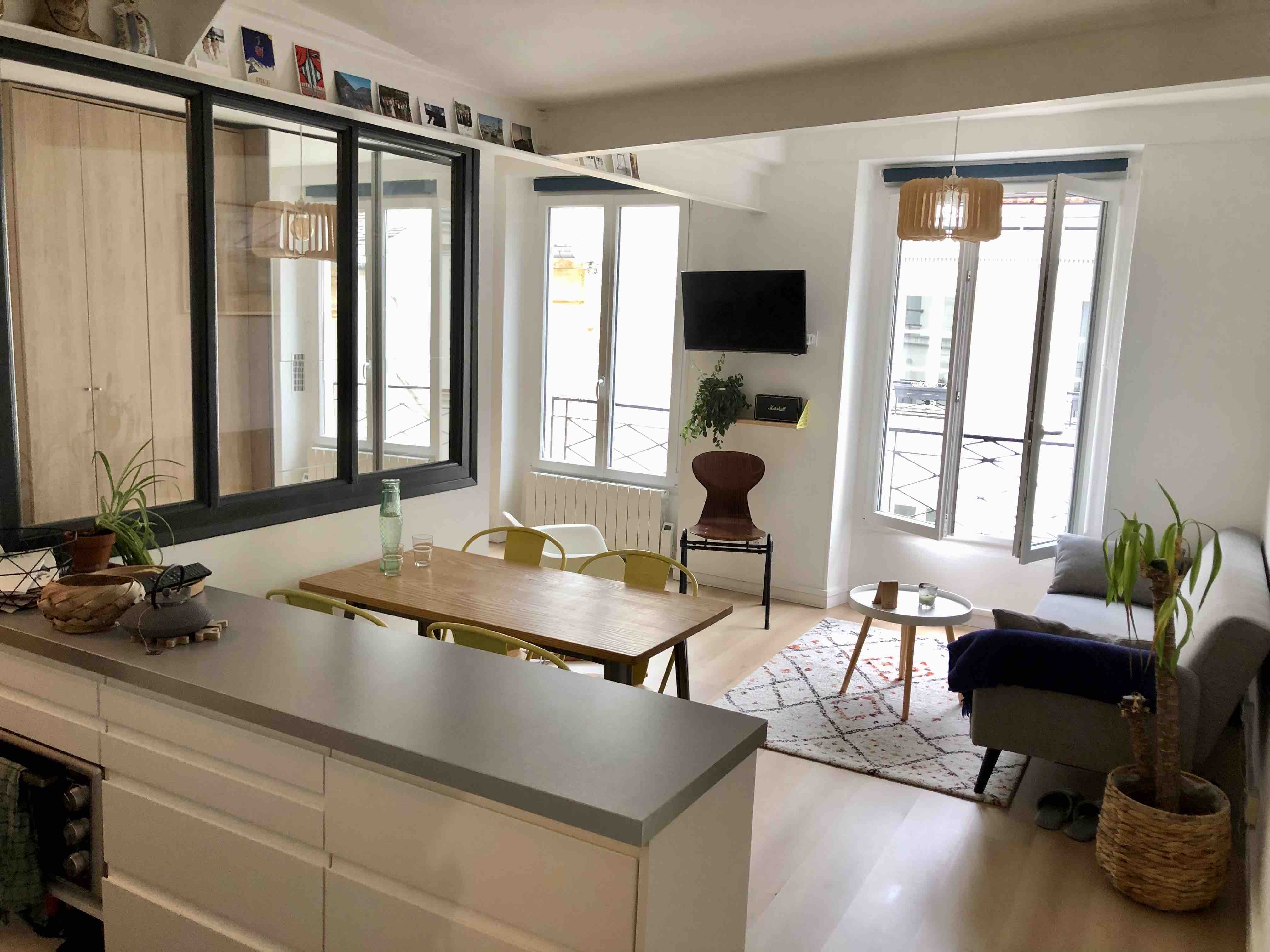 Bonjour,Appartement de 34m² récemment refait à neuf par un architecte.Localisé dans le quartier piéton Montorgueil dans le 2e arrondissement de Paris.Coin nuit (lit double) séparé par une cloison vitrée, salle de bain (douche) avec WC, salon, cuisine. Lave-vaisselle, lave-linge et four à disposition. Au 5ème étage sans ascenseur. Il est...