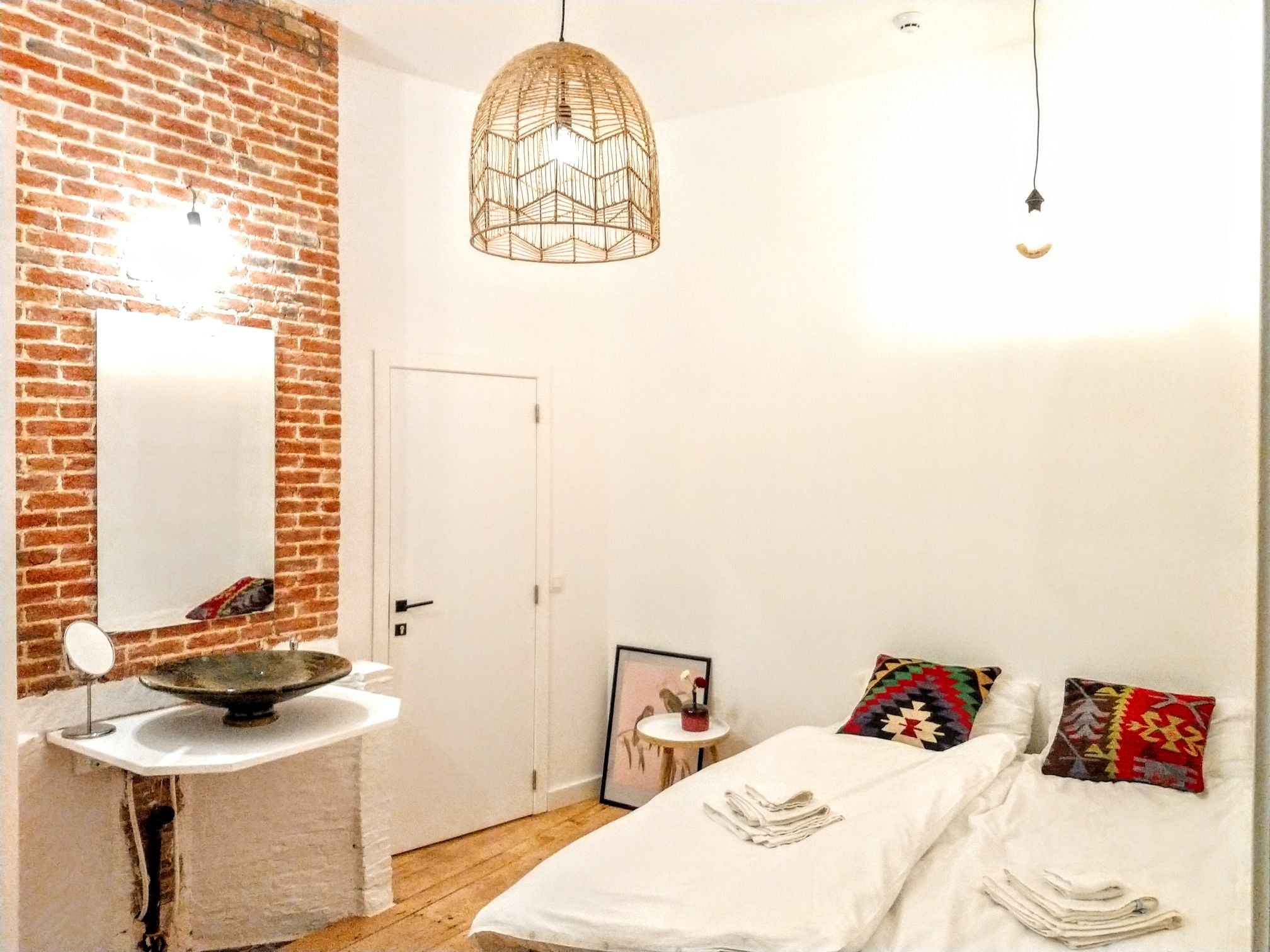 An eccentric yet stylish room in the heart of one of Antwerp's oldest protected town houses. Completely renovated with great brand new boxspring beds, private design shower and toilet. A colourful environment with unique wooden floors and brick mantlepiece that breath timeless luxury.