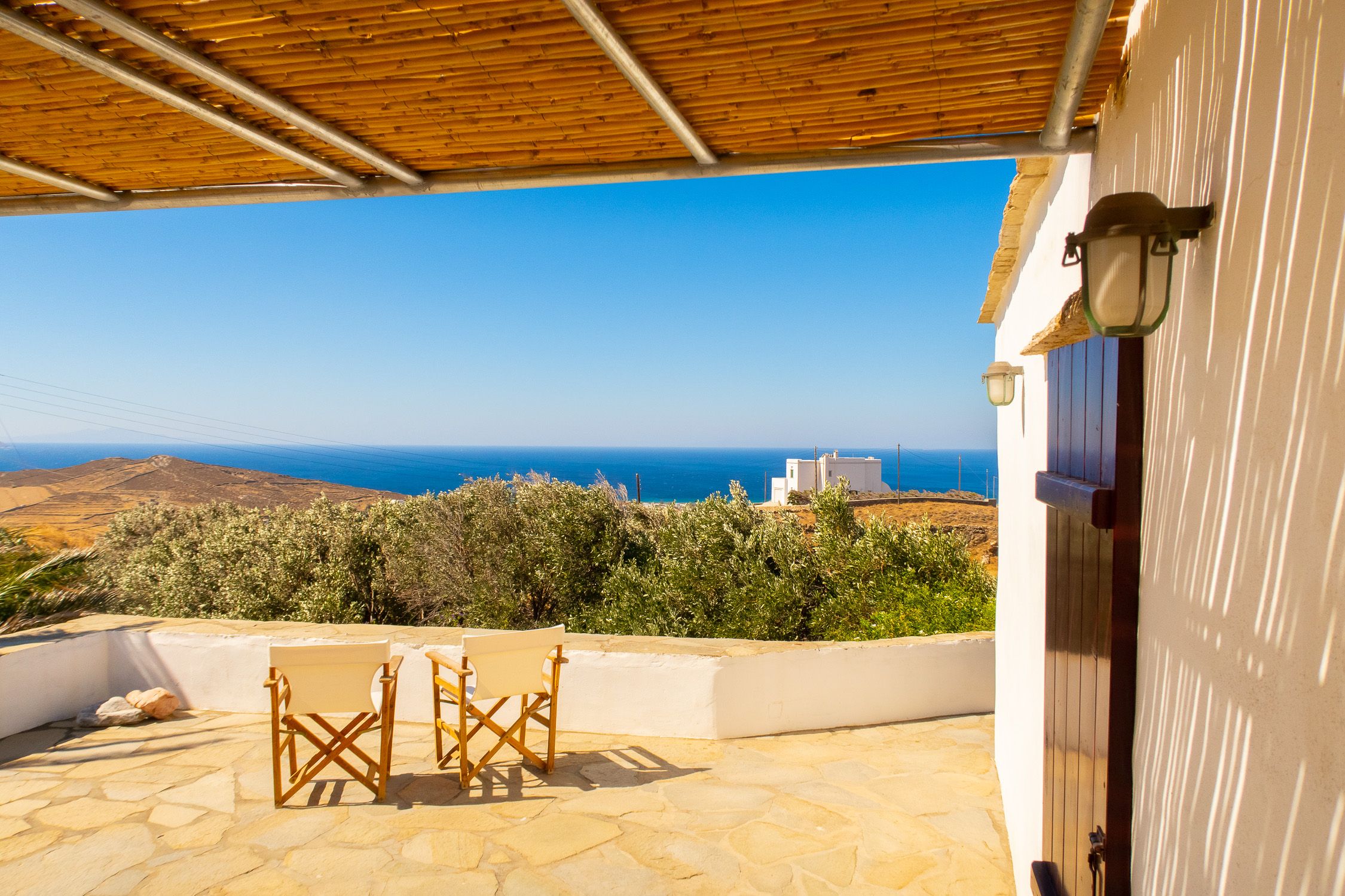 Kykladenhaus auf terrassiertem Grundstück mit Olivenhain und Gartensitzplatz. Fantastischer Blick aufs Meer und die Inseln Mykonos, Delos, Paros u.a.. Alles in der Nähe: Schönster Strand 2,5 km, Städtchen mit Shops etc. 3 km, Dorf mit Tavernen 2 km.