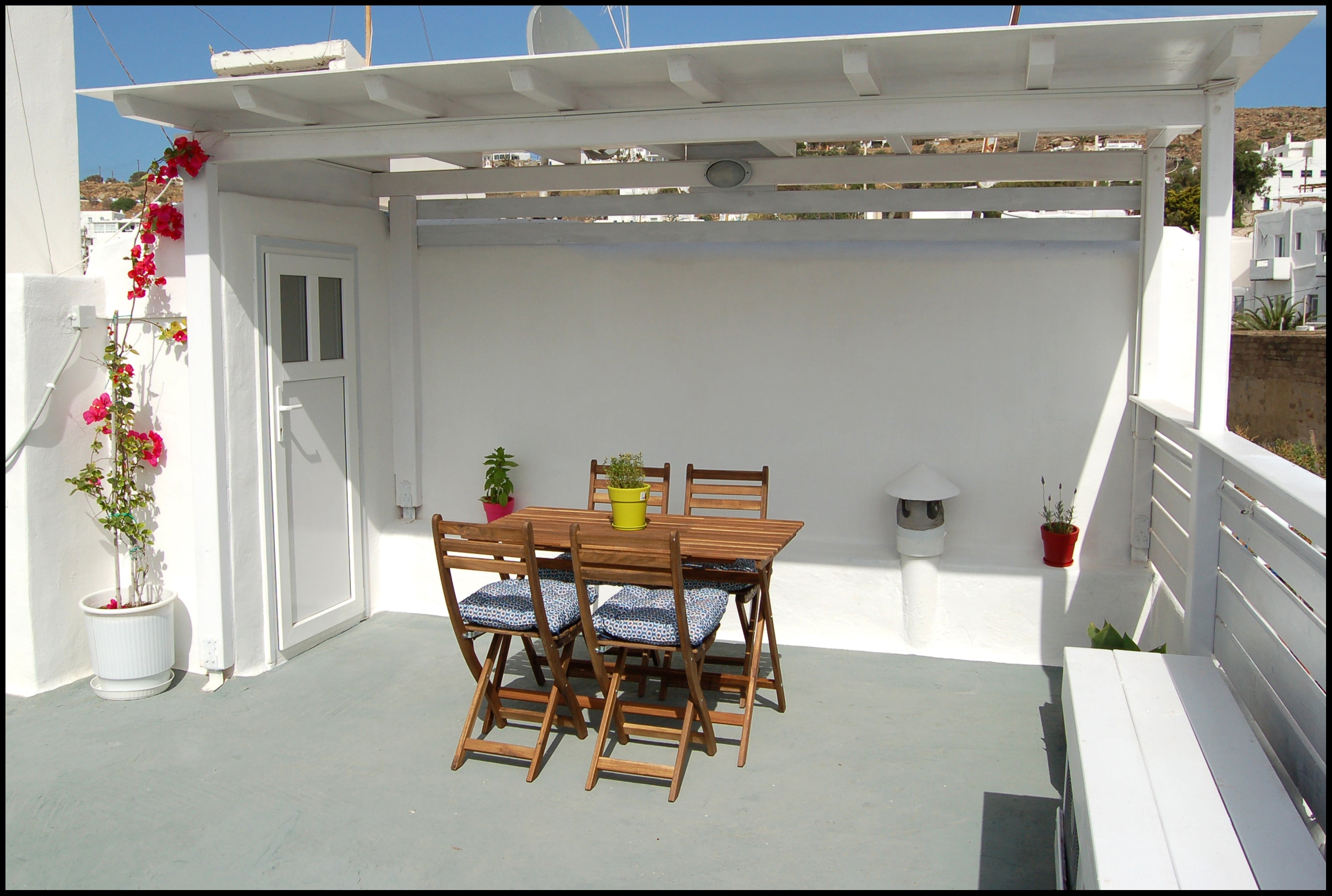 Our typical Mykonian two floor house is situated in the center of Mykonos Town (Chora) near the Windmills and just a few meters away from the central bus station of the island. The ground floor contains a living room with a sofa bed, a fully equipped kitchen and a bathroom. An interior wooden staircase leads to the first floor which contains a master bedroom with a double bed and a low ceiling bedroom with two single beds. There is also an access to the the rooftop terrace.