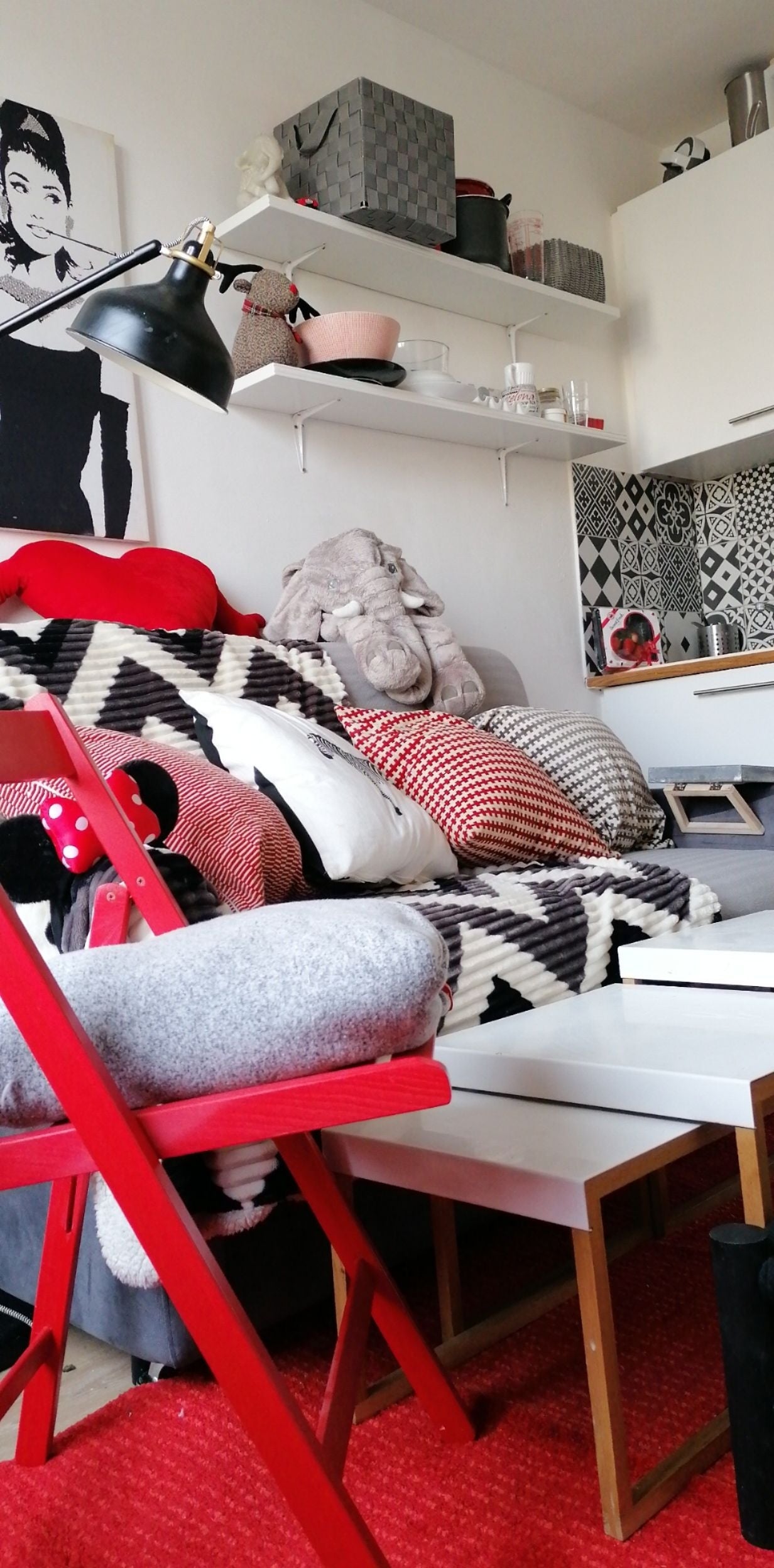-Une chambre et une pièce avec kitchinette et canapé lit.