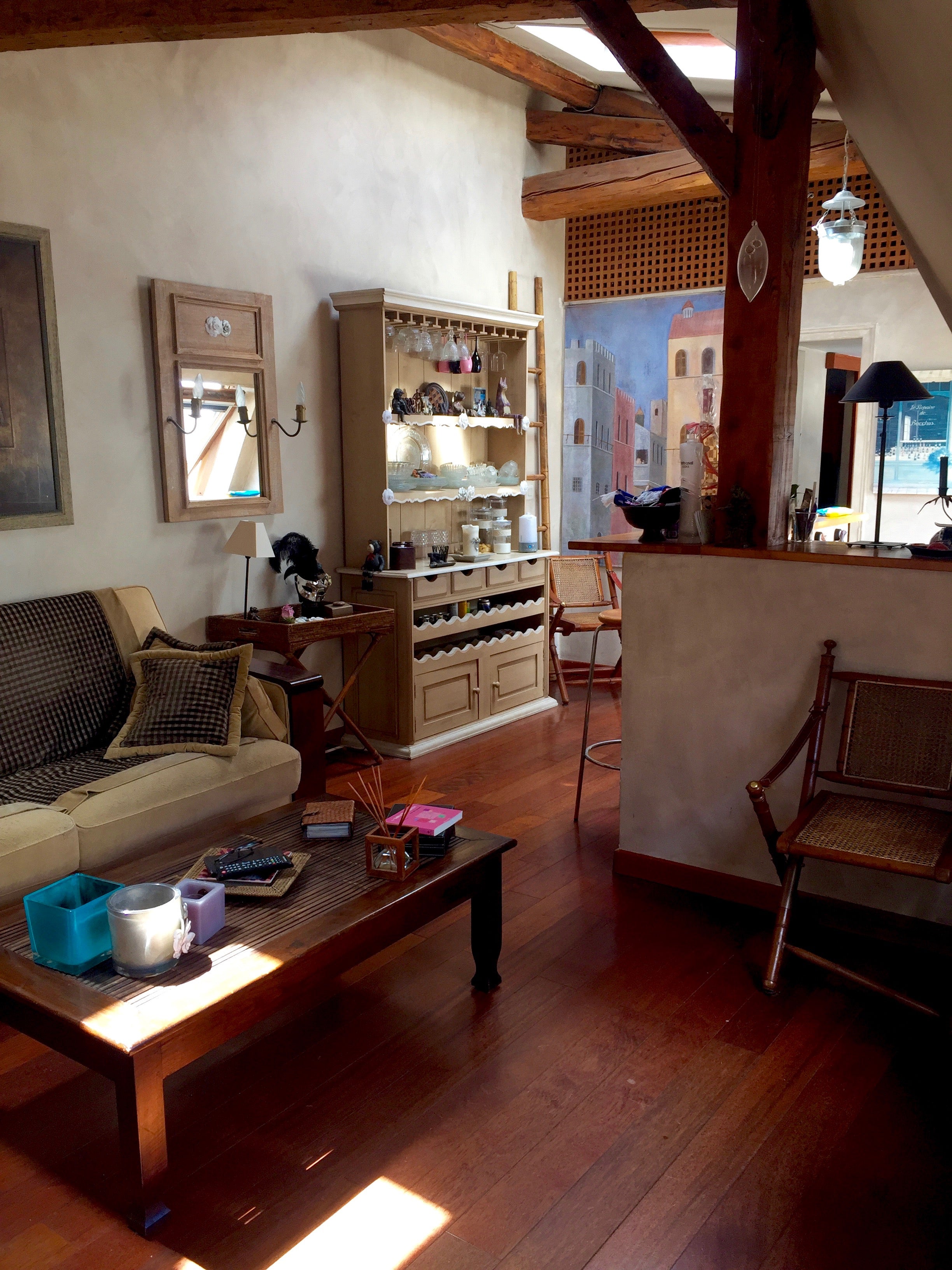 Appartement deux pièces, bien équipé, lumineux et cosy. Appartement avec grand cachet, au sixième et dernier étage avec poutres apparentes.
