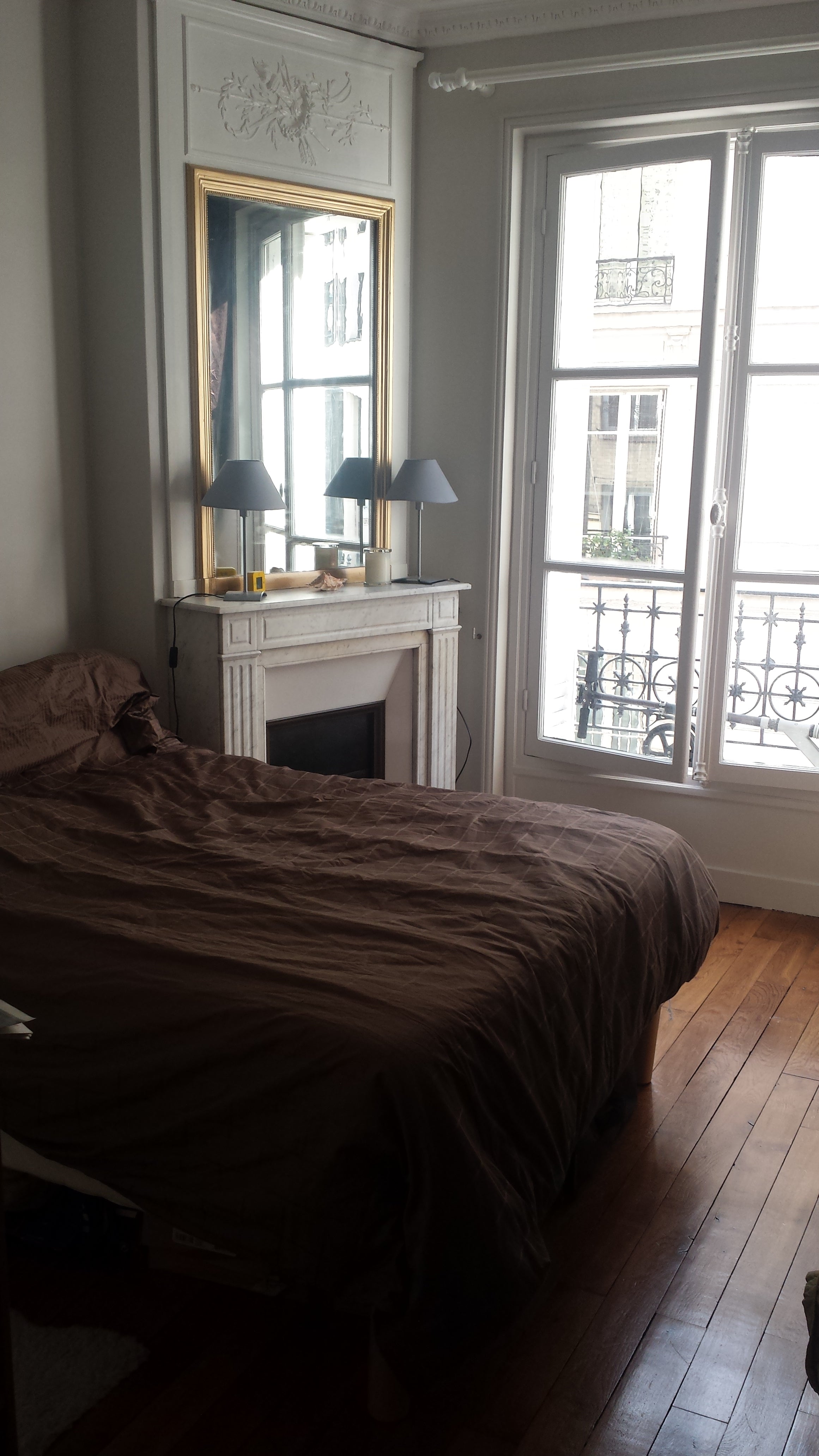 Chambre et salon avec moulures et cheminée, parquet en bois. Cuisine avec table Paris, France Bel appartement, quartier buttes-aux-cailles Entire rental unit vacation rental 12661975