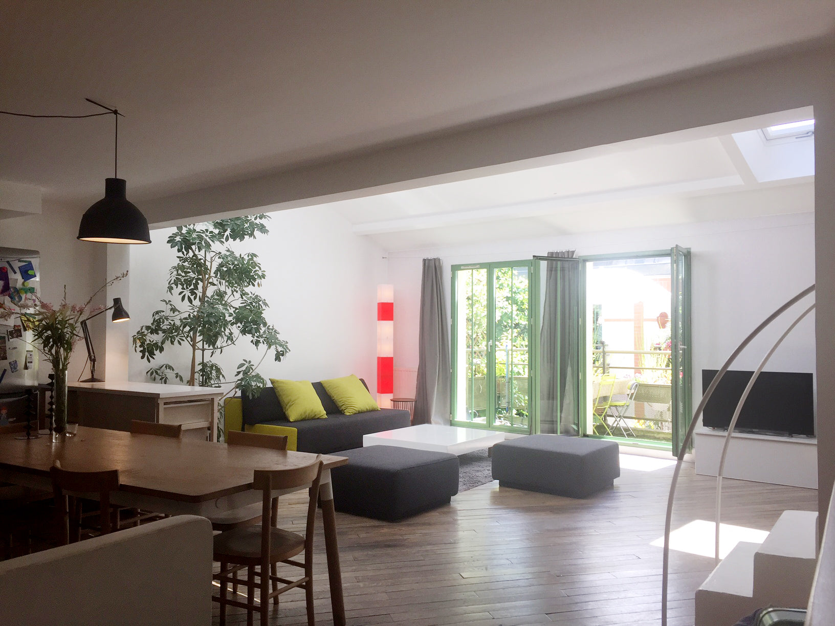 Maison familiale atypique de 120m2 avec joli petit jardin et balcon totalement au calme au fond d'une grande cour privée. La maison est orientée plein sud et bénéficie de grands volumes très lumineux. Vous pourrez apprécier votre petit déjeuner au soleil sur le balcon accompagné par le chant des oiseaux.