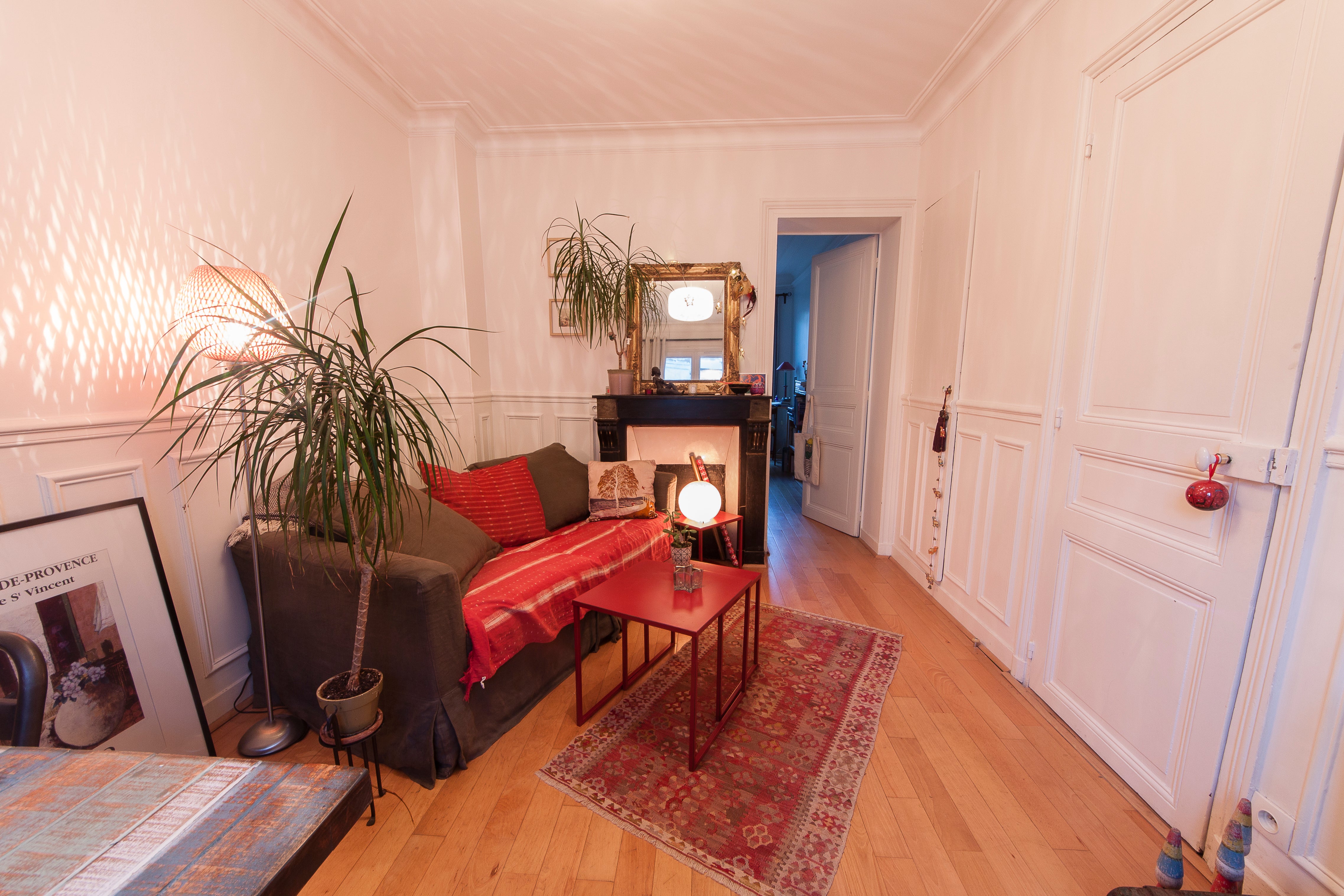 Accueillant 2 pièces de 35m² typiquement parisien, moulures, cheminée dans chaque pièce (inutilisables en l'état) et parquet, charmant petit balcon avec une table et deux chaises pour paresser dehors au milieu des plantes :-)