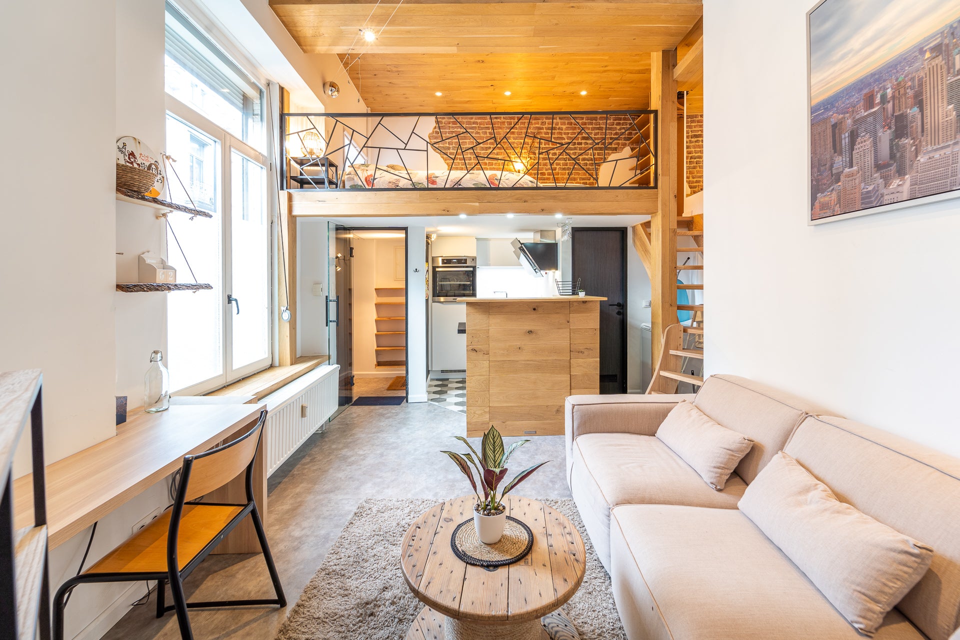 Entrée privative avec espace vestiaire/Cuisine toute équipée, petit salon fonctionnel avec espace bureau/Salle de bains avec toilette et douche italienne/Machine à laver/Chambre à coucher (HSP - 1m72) à l'étage avec dressing /Wifi inclus