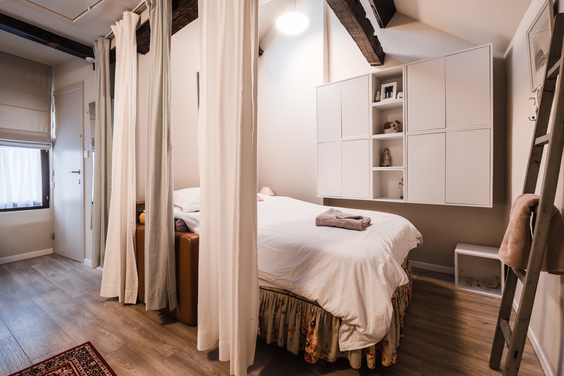 Antique wooden beams , a wooden balcony , design Italian leather Queen sized sofabed en original small wooden stairs give this room an unique experience to stay in.