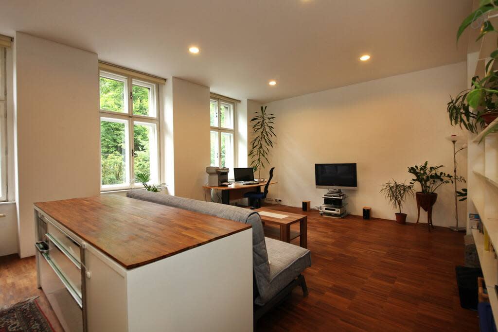 Its surface is 80 m2, it has one bedroom, a separate bedroom/ living room with a comfortable convertible a bathroom and a fully equipped open kitchen corner. It is on a second floor without elevator. On the bedroom side windows are on the courtyard so it is very quiet. The living room enjoys beautiful views of the park, but you can hear the street below during rush hours. Of course the apartment has high-speed Wi-Fi (40 MB download). Good internet connexion and powerful Wi Fi, several monitors, two large working desks make it a favorite for digital nomads.