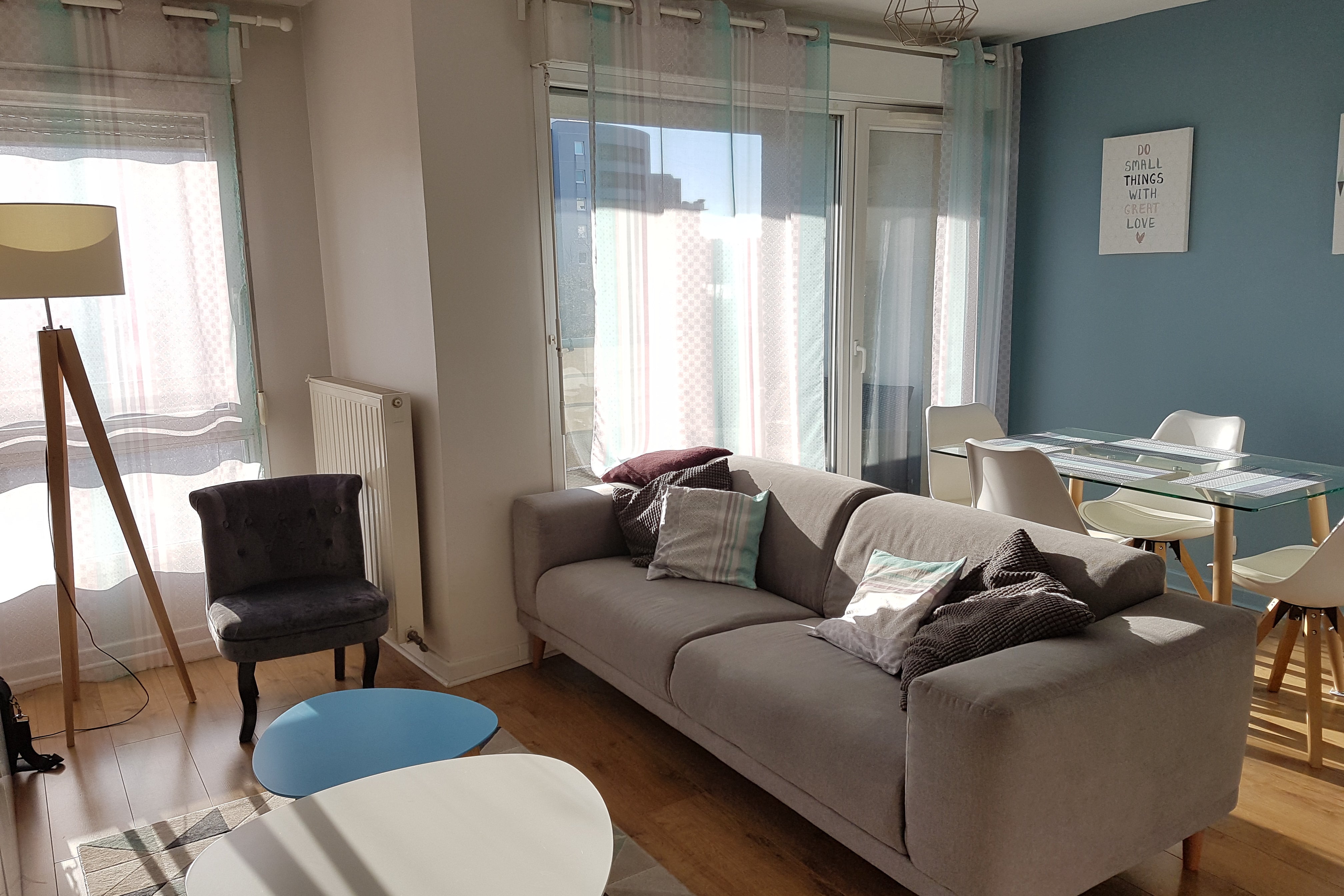 Agréable T3 de 55 m2 lumineux avec sa pièce de vie ouverte sur cuisine toute équipée et salon cosy avec balcon.