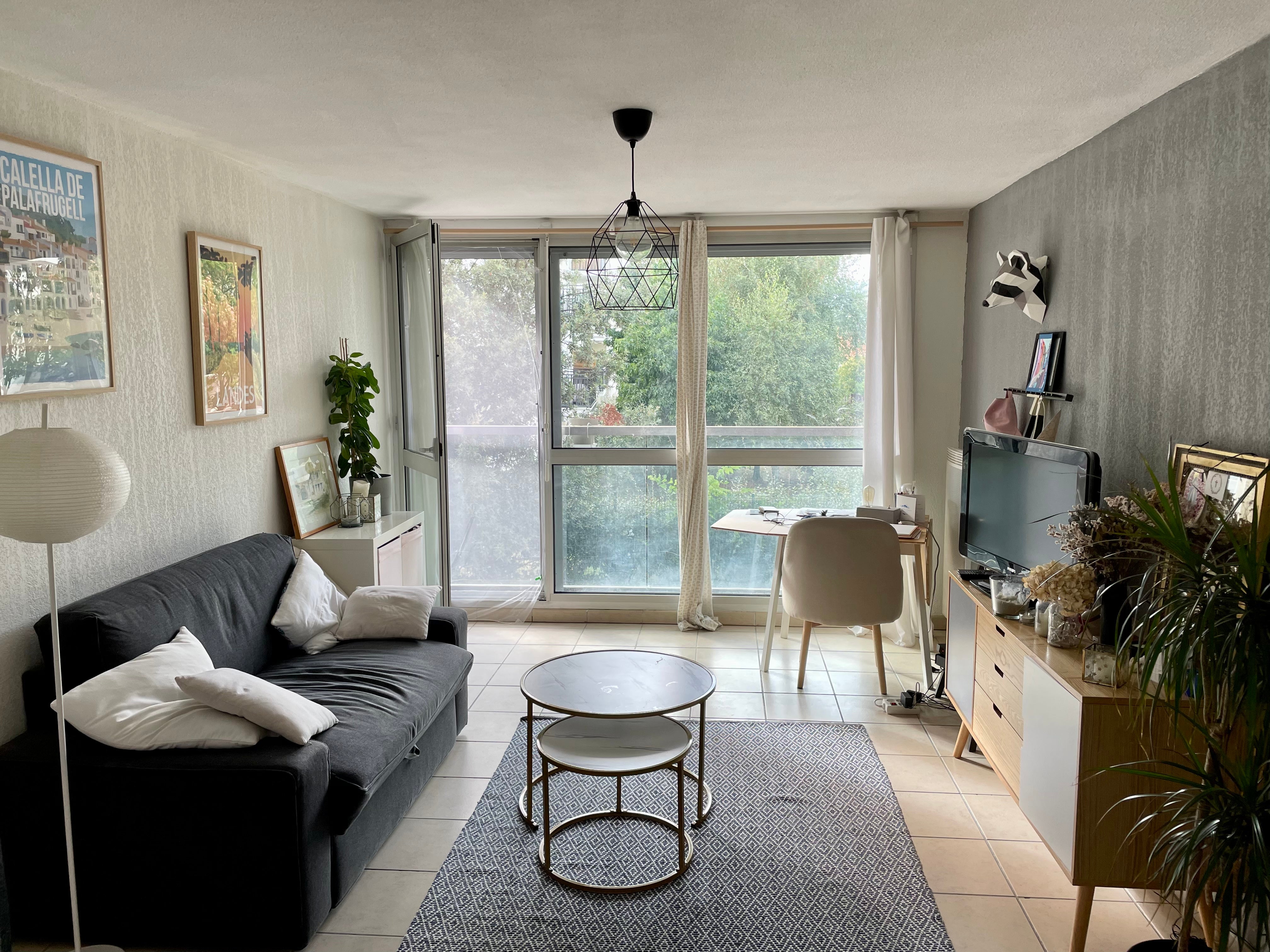 Appartement de 40m2 situé dans le quartier des chartrons. Salon avec grande baie vitrée, canapé table basse et télévision.