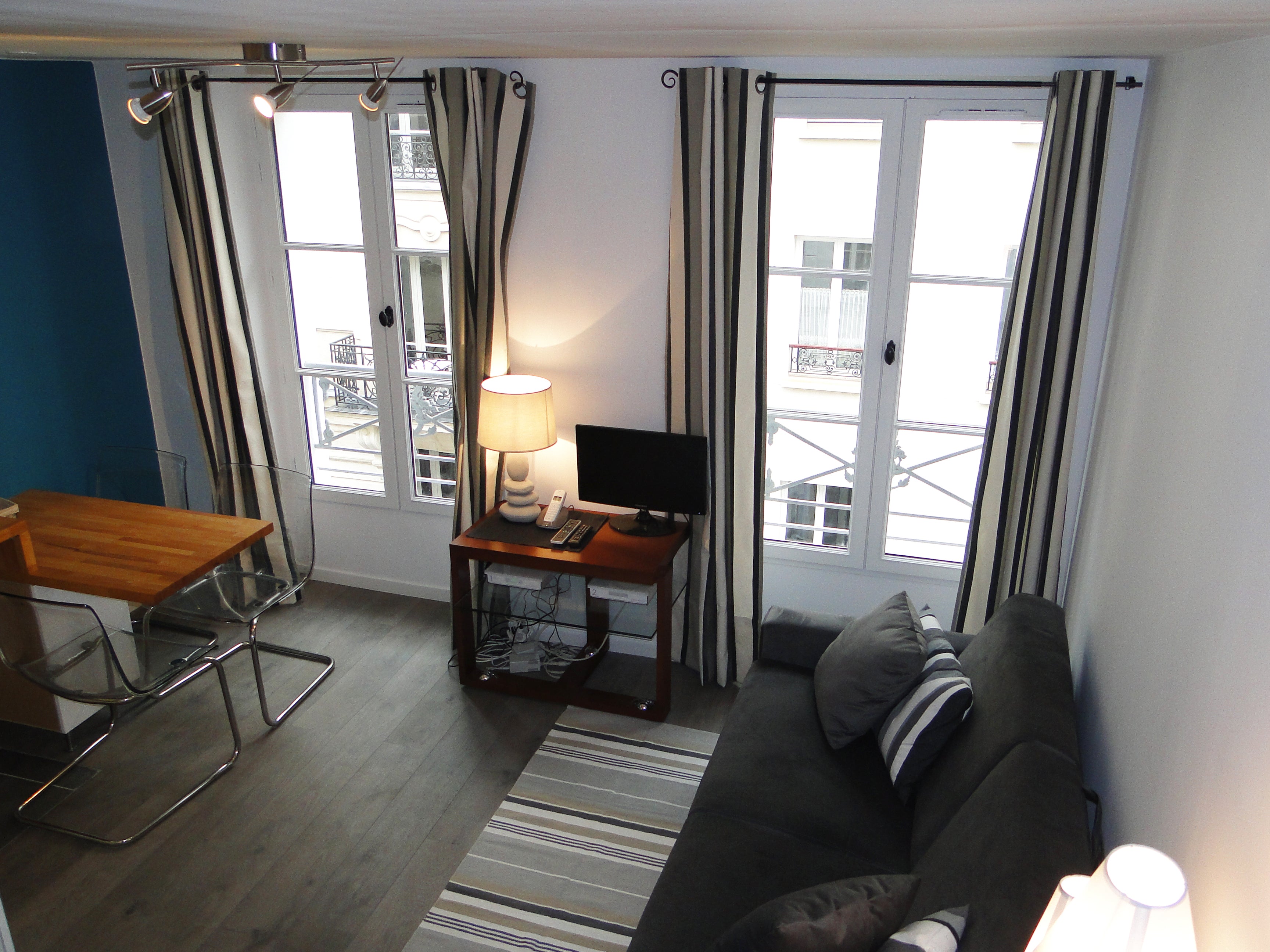 Appartement traversant (fenêtre côté rue de Lévis et coté chambre, rideaux à toutes les fenêtres).