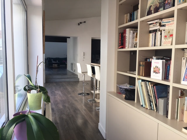 Chambre aménagée avec salle de douche et toilettes privatives, un grand dressing, et un petit salon d'accueil en jouissance partagée, dans une maison de caractère, rénovée (type loft) en centre-ville, dans une rue très calme.
