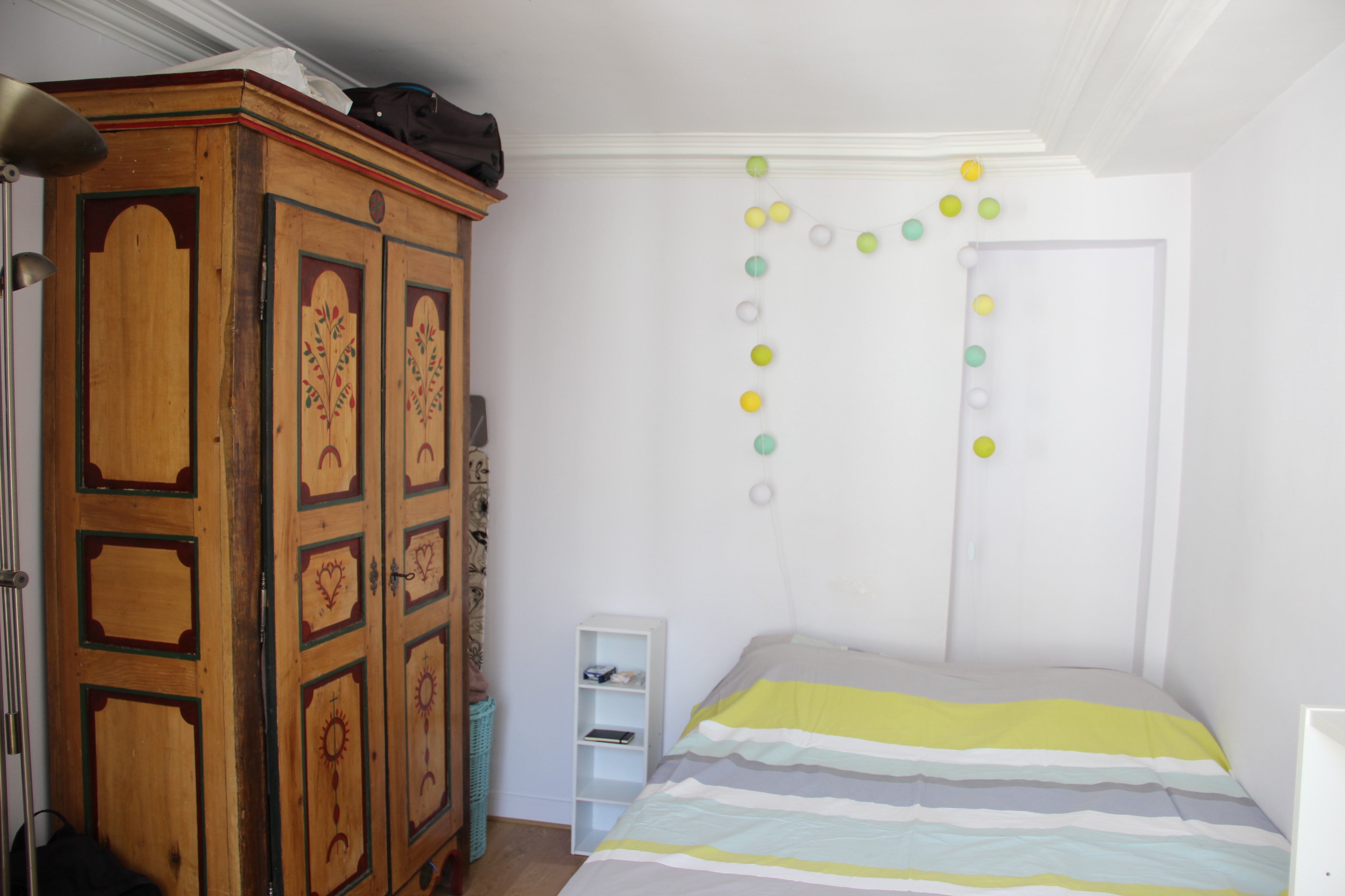 Nice space with recent parquet floor and white walls, cosy, bright and very quiet.