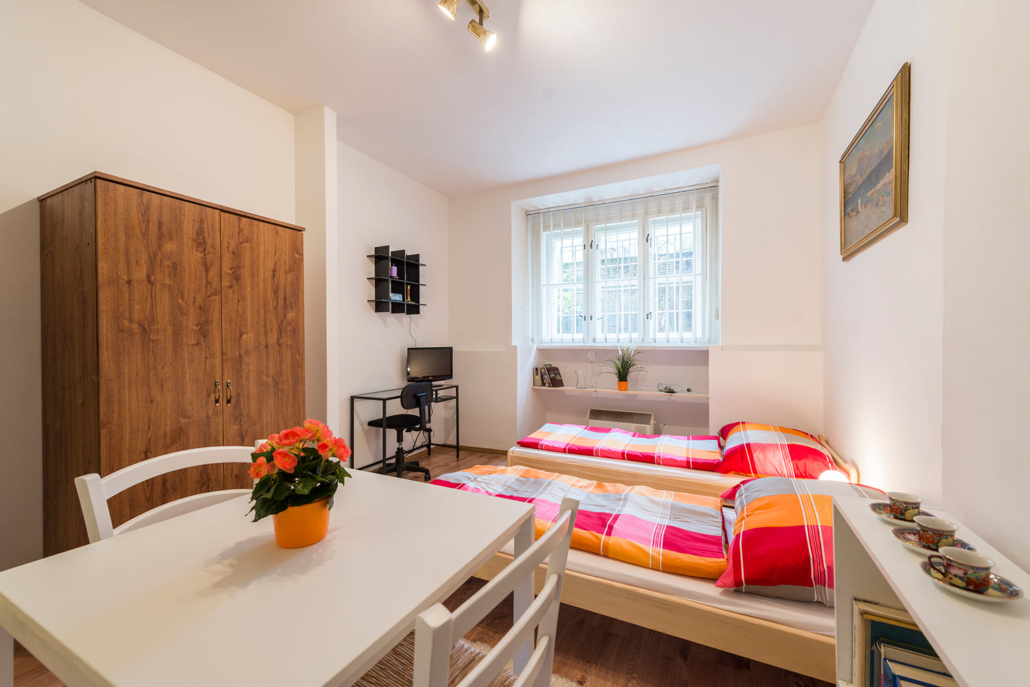 Byt se nachází v suterénu s velkým oknem do zeleně a dvora.Adresa je velmi atraktivní a přesto klidná.