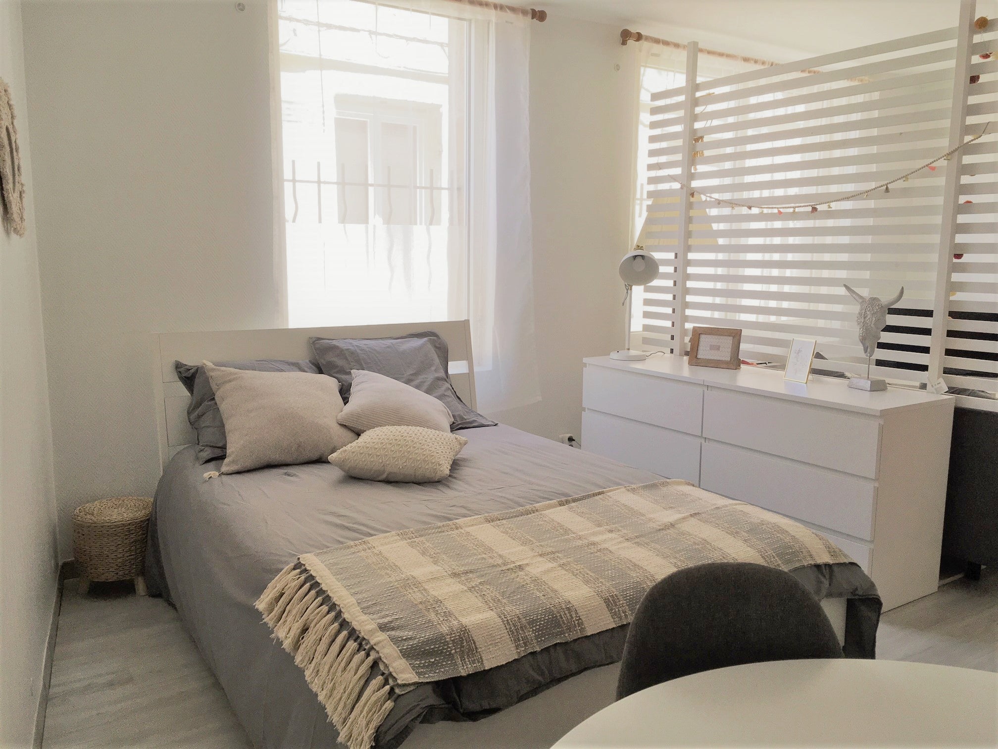 Joli appartement bordelais de 31 m2 avec cuisine équipée, une salle de bain, un salon et un grand lit .