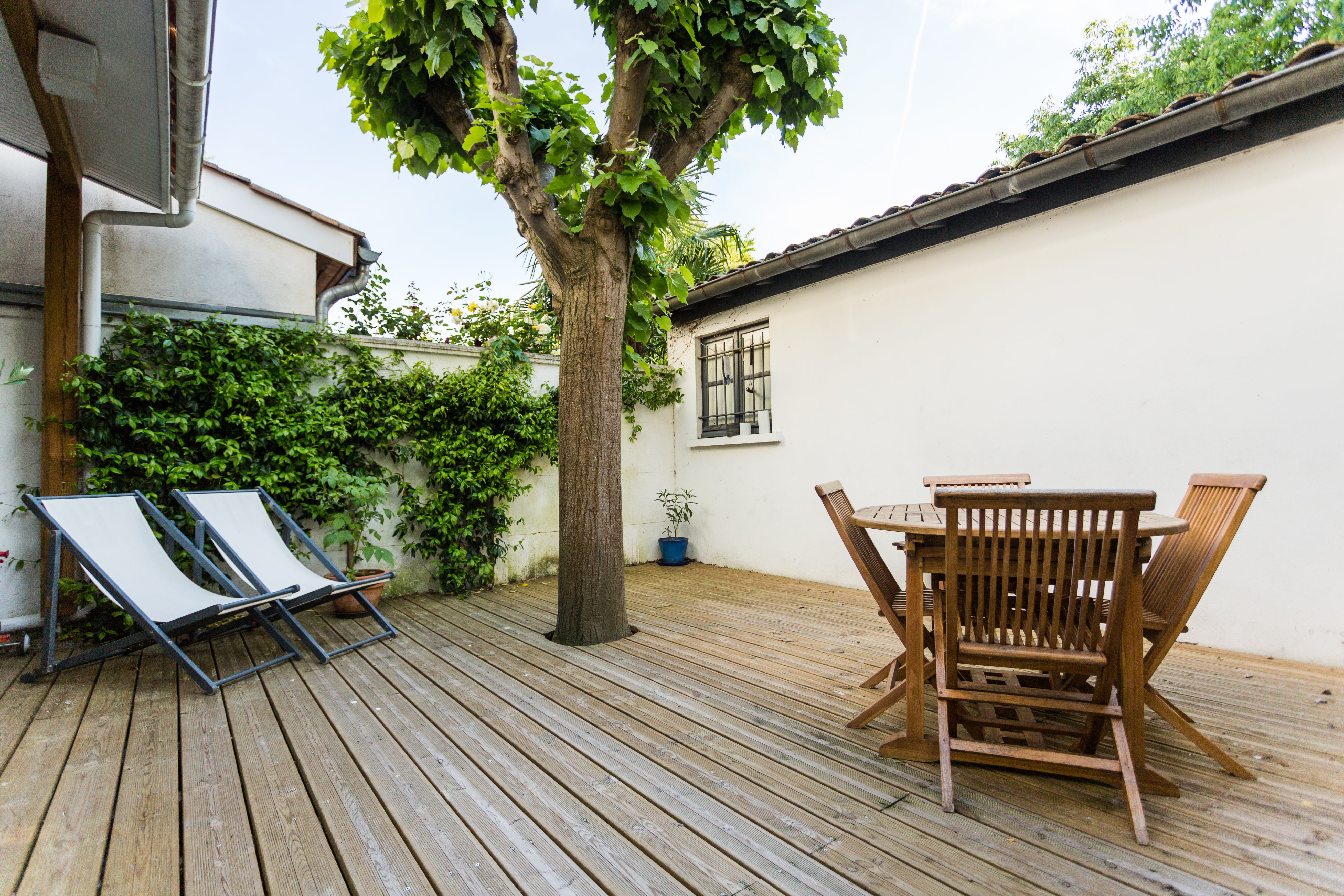 Jolie terrasse ensoleillée et arborée d'un tilleul pour profiter de l'extérieur.