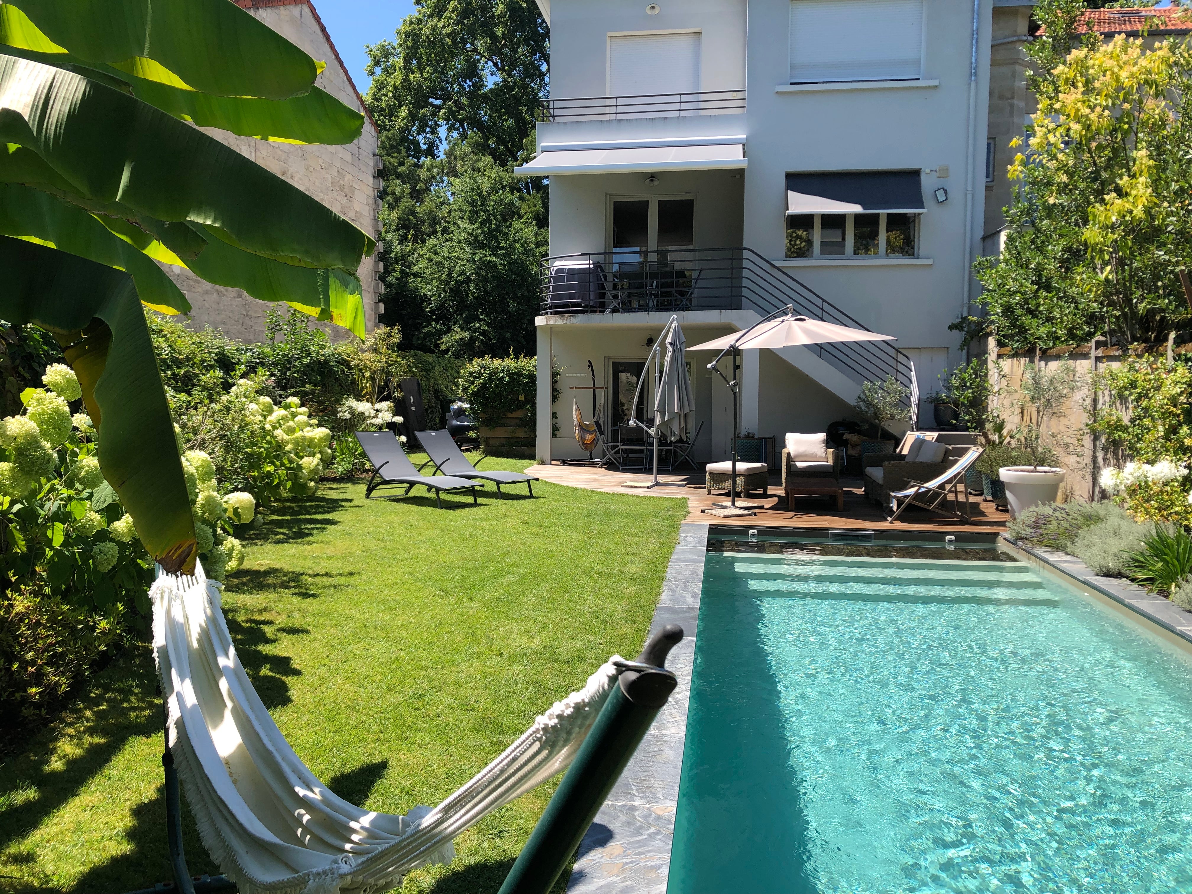 Loue Bordeaux Caudéran maison familiale, calme, climatisée, de 240m2, 10 couchages, 6 chambres, terrasse, grand séjour lumineux, piscine, jardin, parking privatif pour 2 véhicules, en face du parc bordelais. 1 salle de bain, 3 salles d’eau. Cuisine + kitchenette. 15 mn de Bordeaux centre en voiture, bus, vélo. 1h du bassin d’Arcachon, 45 mn de Saint-Emilion et des vignobles. Idéal pour 1 ou 2 familles