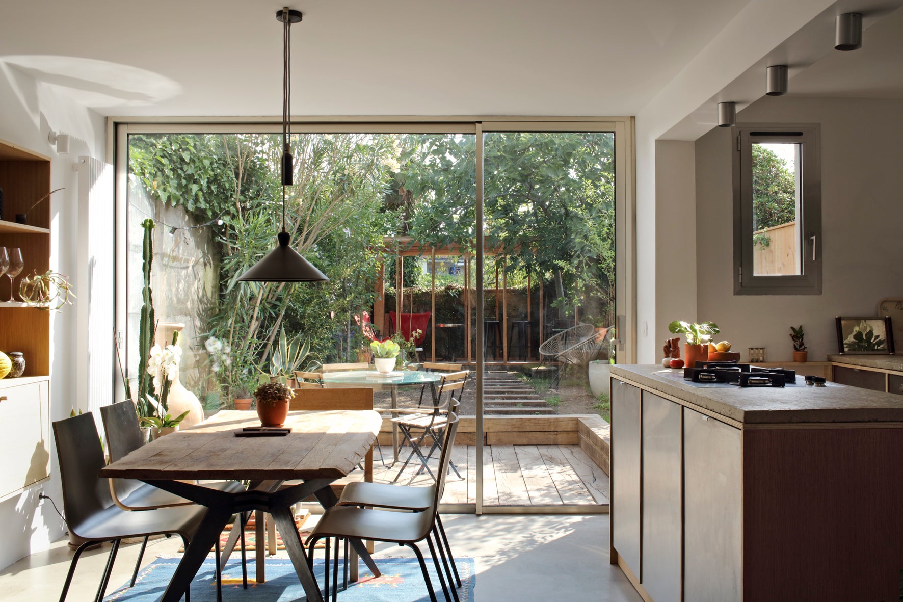 A l’intérieur de la maison, les matières, les plantes d’espèces variées, les couleurs des tissus relèvent chaleureusement l'ambiance . Un mobilier en contreplaqué de chêne structure l’intérieur : portes, encadrements des meubles de cuisines, bibliothèque, vaisselier, bureau, cadre de lit, dressing, étagères dans les chambres ou encore meuble de séparation de l’escalier.