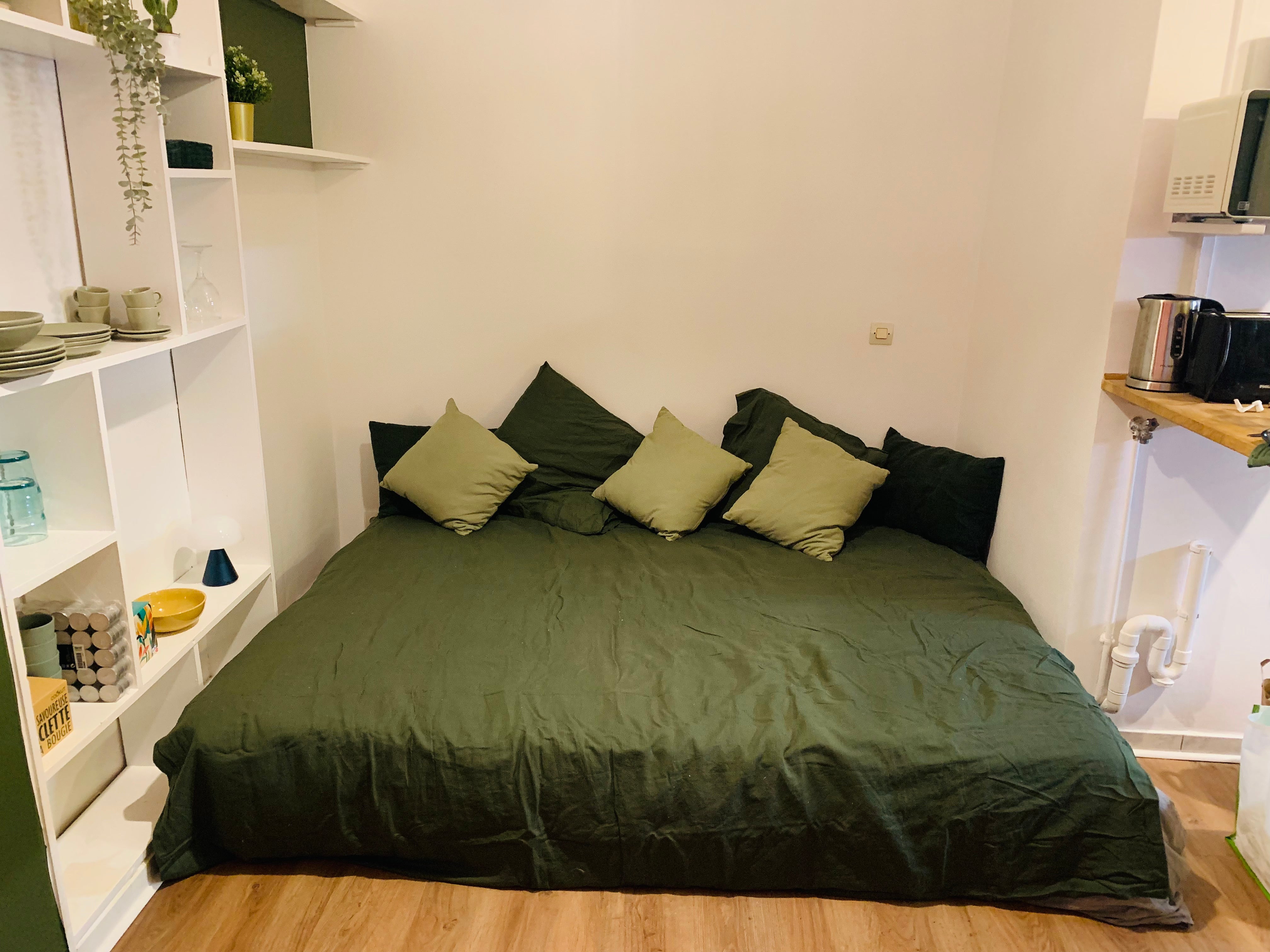 Il se compose d'une pièce à vire avec un lit empilable Ikea Utaker, et d'une salle de bain avec douche. très calme (sur cour) et joliment décoré.