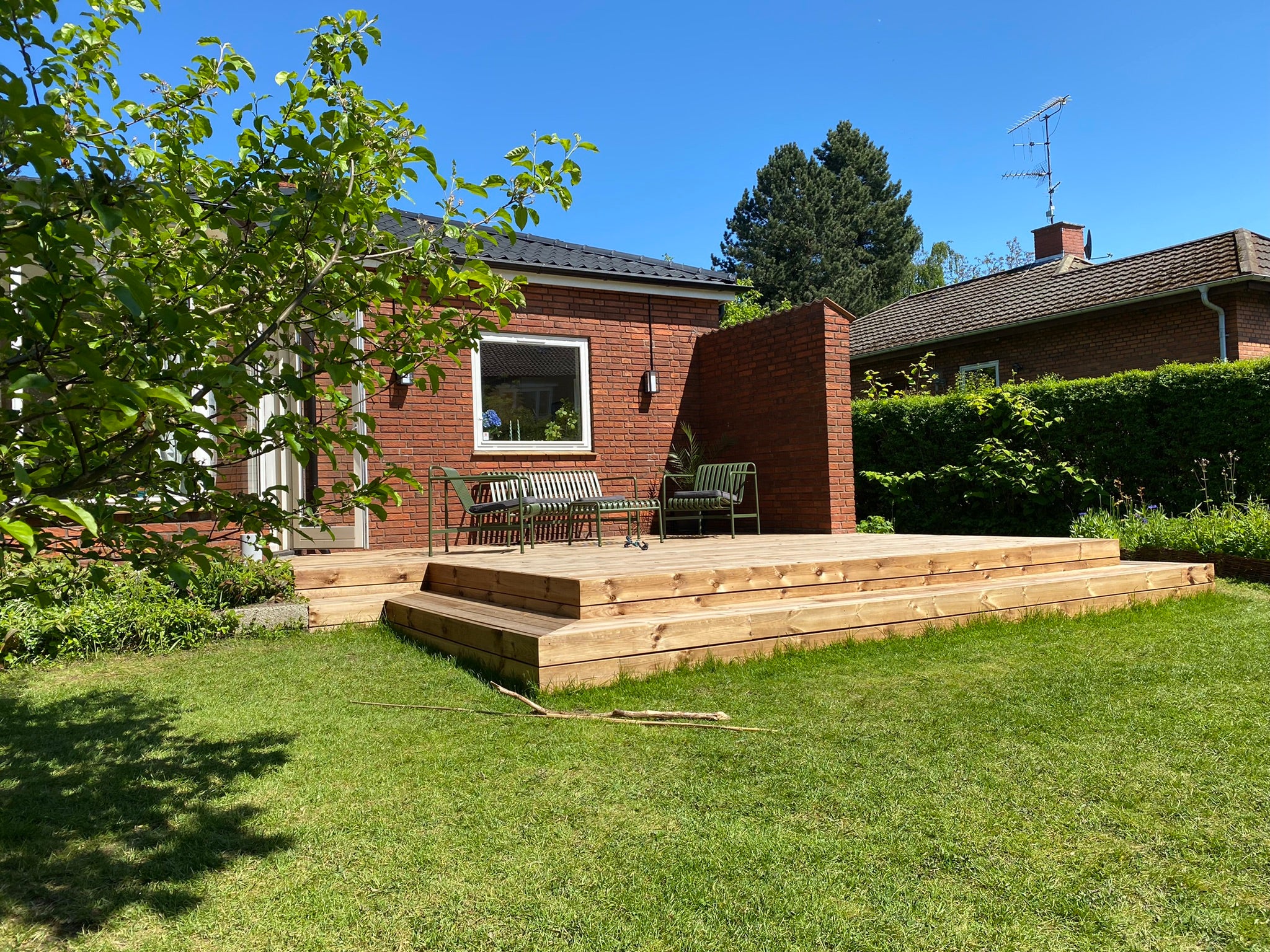 De to træterrasser er tilgængelige fra stue samt køkken og giver samtidig adgang til henholdsvis forhave og baghave. Der findes både trampolin, fodboldmål, sandkasse og legehus i haven. Derudover er der en flot rund fliseterrasse under det store æbletræ i baghaven.