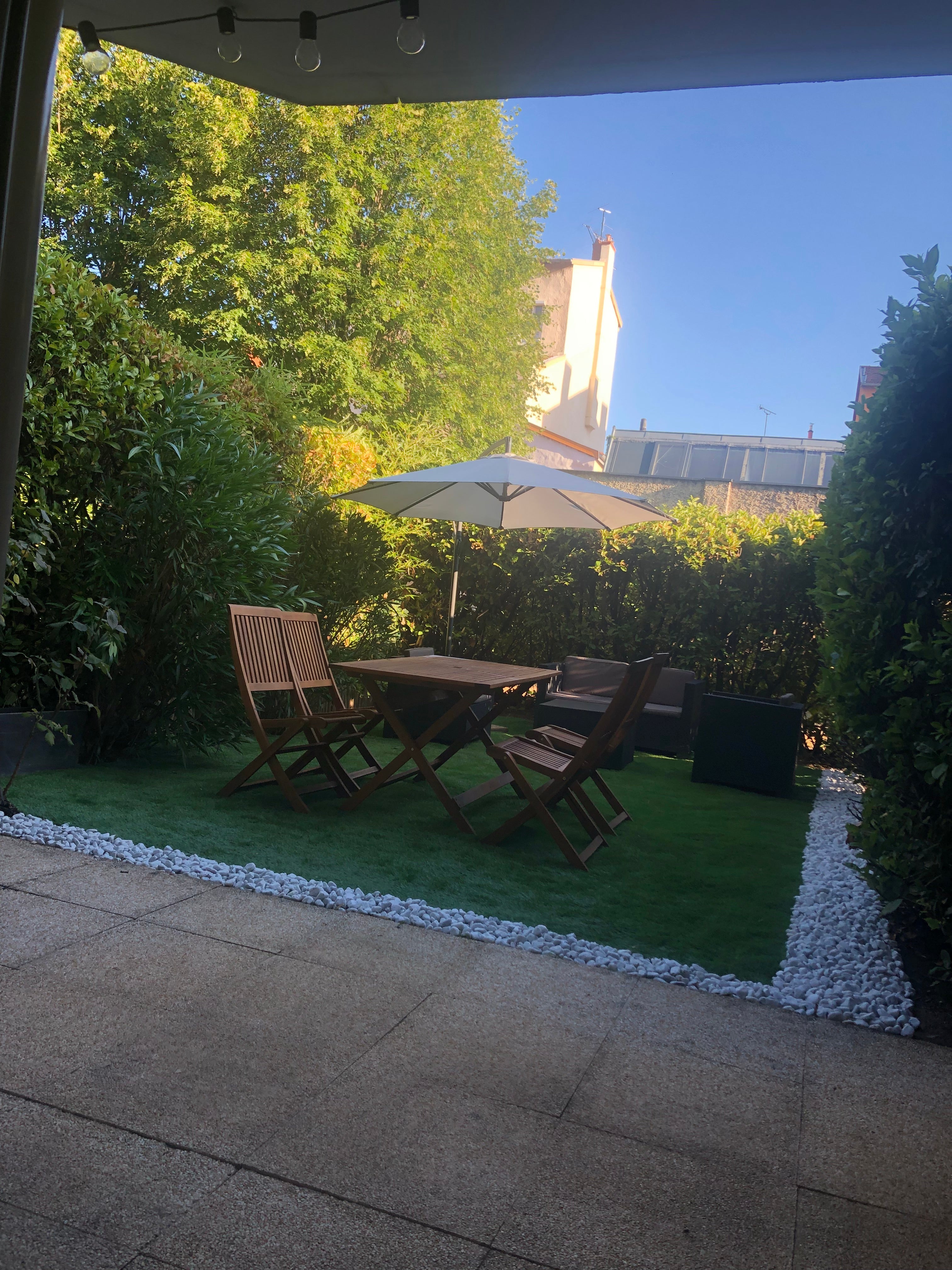 Ce Rez de jardin comprend : une salle de bain, un jardin de 50m2, une cuisine ouverte sur le salon.
