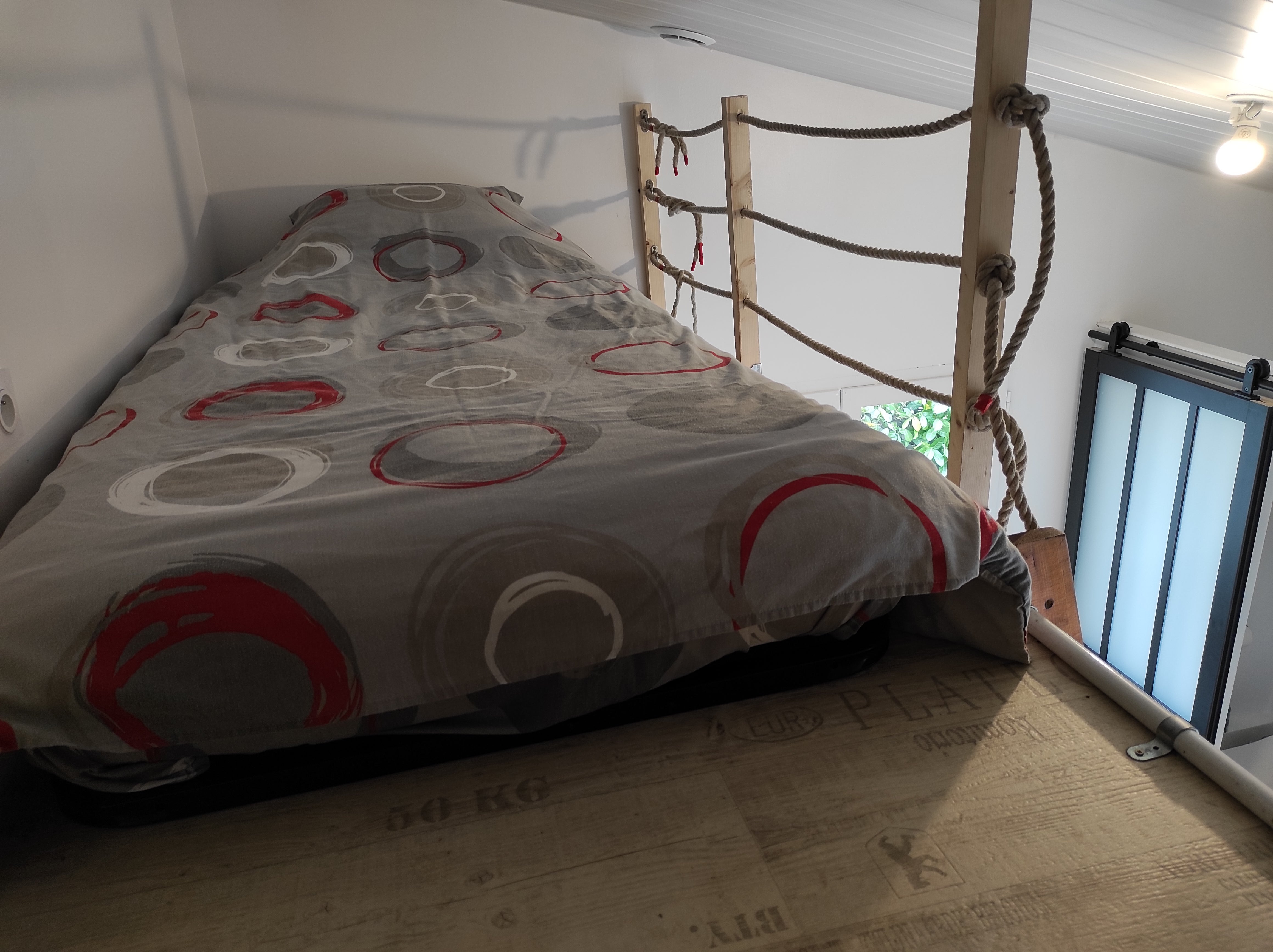 1 personne : 1 lit de 90cm sur la mezzanine, accessible par échelle verticale, petit dressing sur la mezzanine.