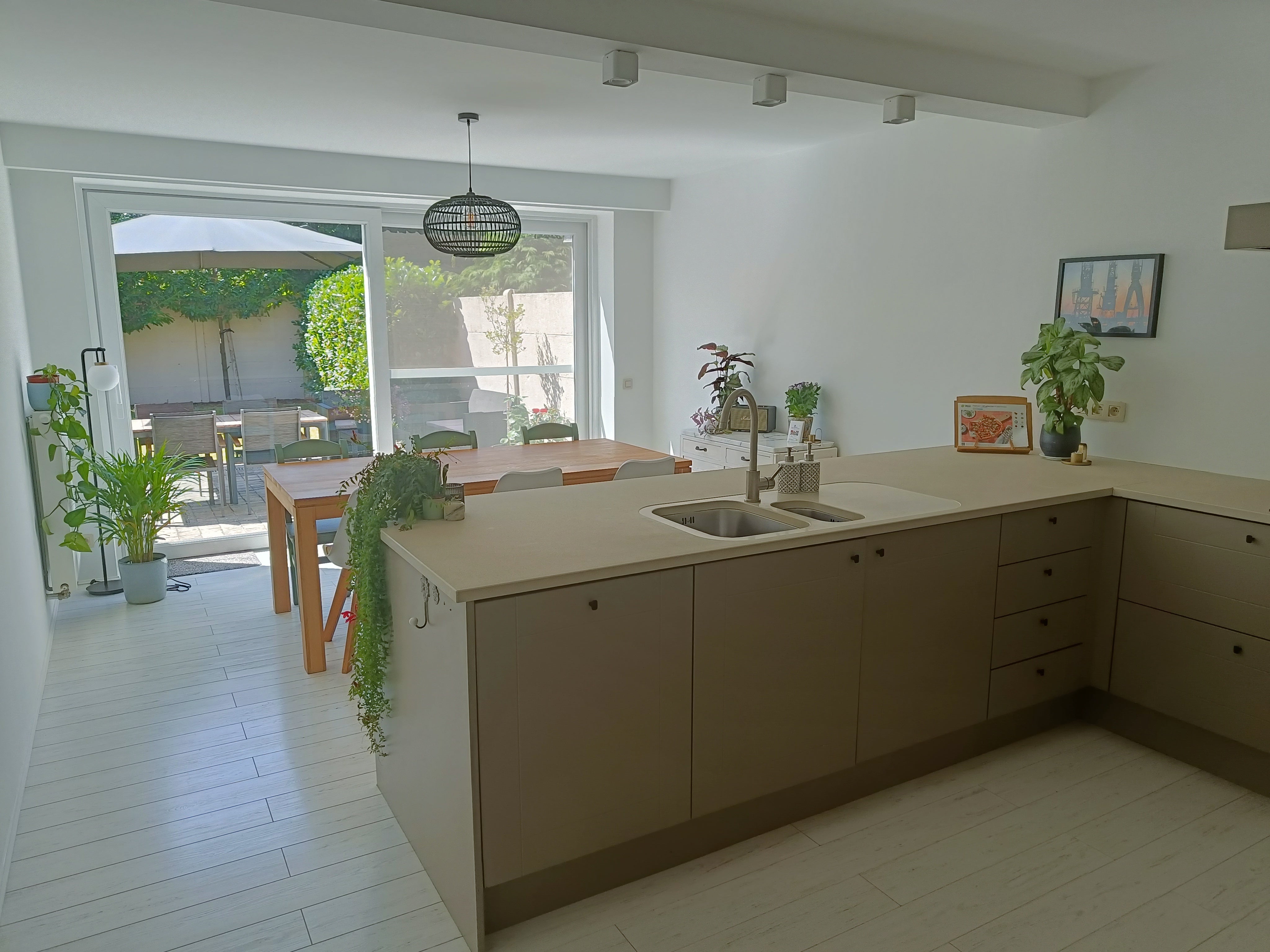 Aansluitend is er een lichte eetruimte met houten tafel waarbij je zicht hebt op de tuin.